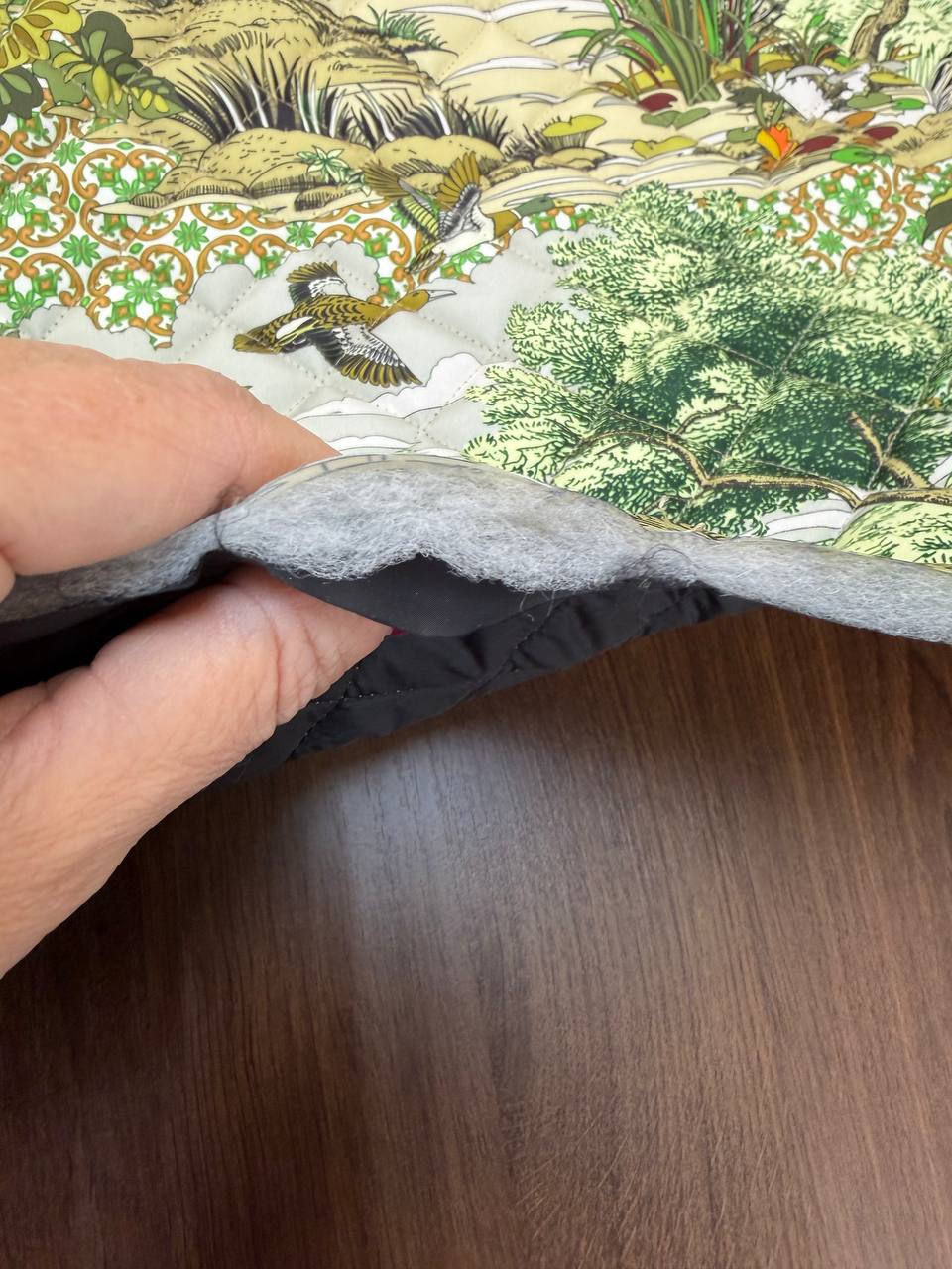 Ткань курточная, очень мягкая, не толстая. с подкладкой, наполнитель синтепон.