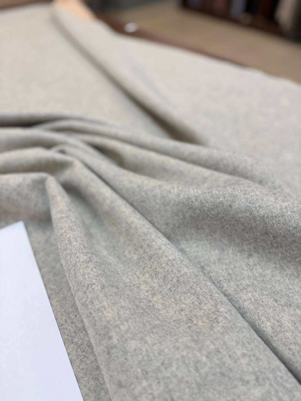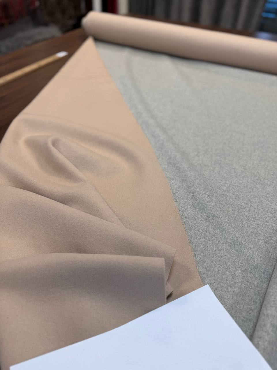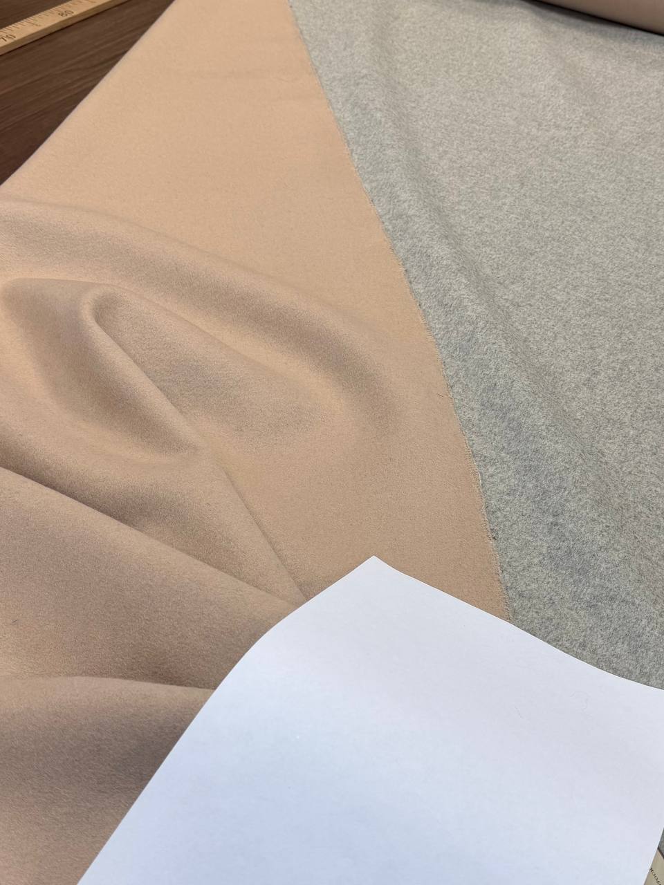 Остаток 6.8 м. Пальтовая ткань шерсть с кашемиром Duble. Одна сторона теплый бежевый, вторая светло-серый меланж. Разделяется хорошо. Шьем двусторонние легкие пальто, жилеты или бомберы.