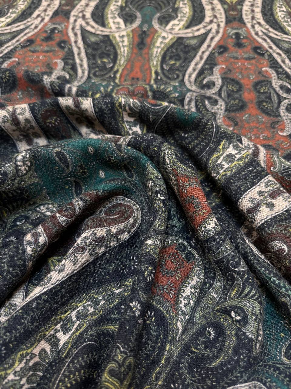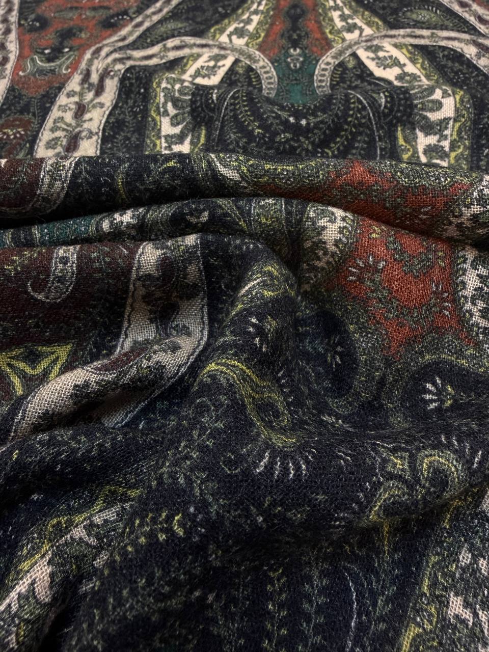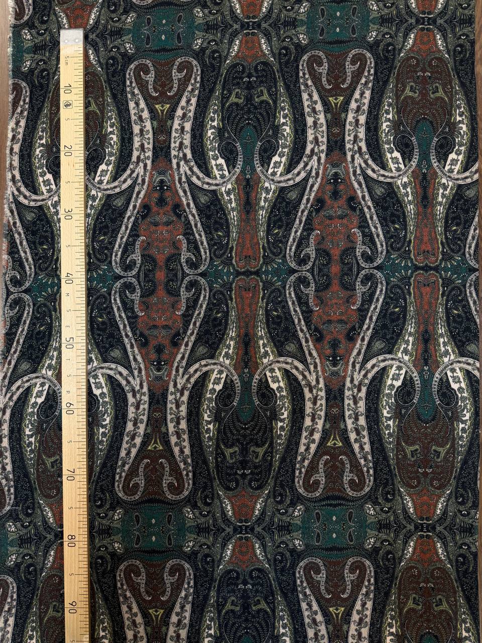Остаток 4.9 м. Прекрасная плательная ткань. Полотно шероховатое, очень мягкое и уютное. Тактильно больше ощущается шерсть. Шьем платья, блузки, юбки, а так же можно использовать для палантинов. Принт напечатан. Рисунок Etro, рапорт 78см.