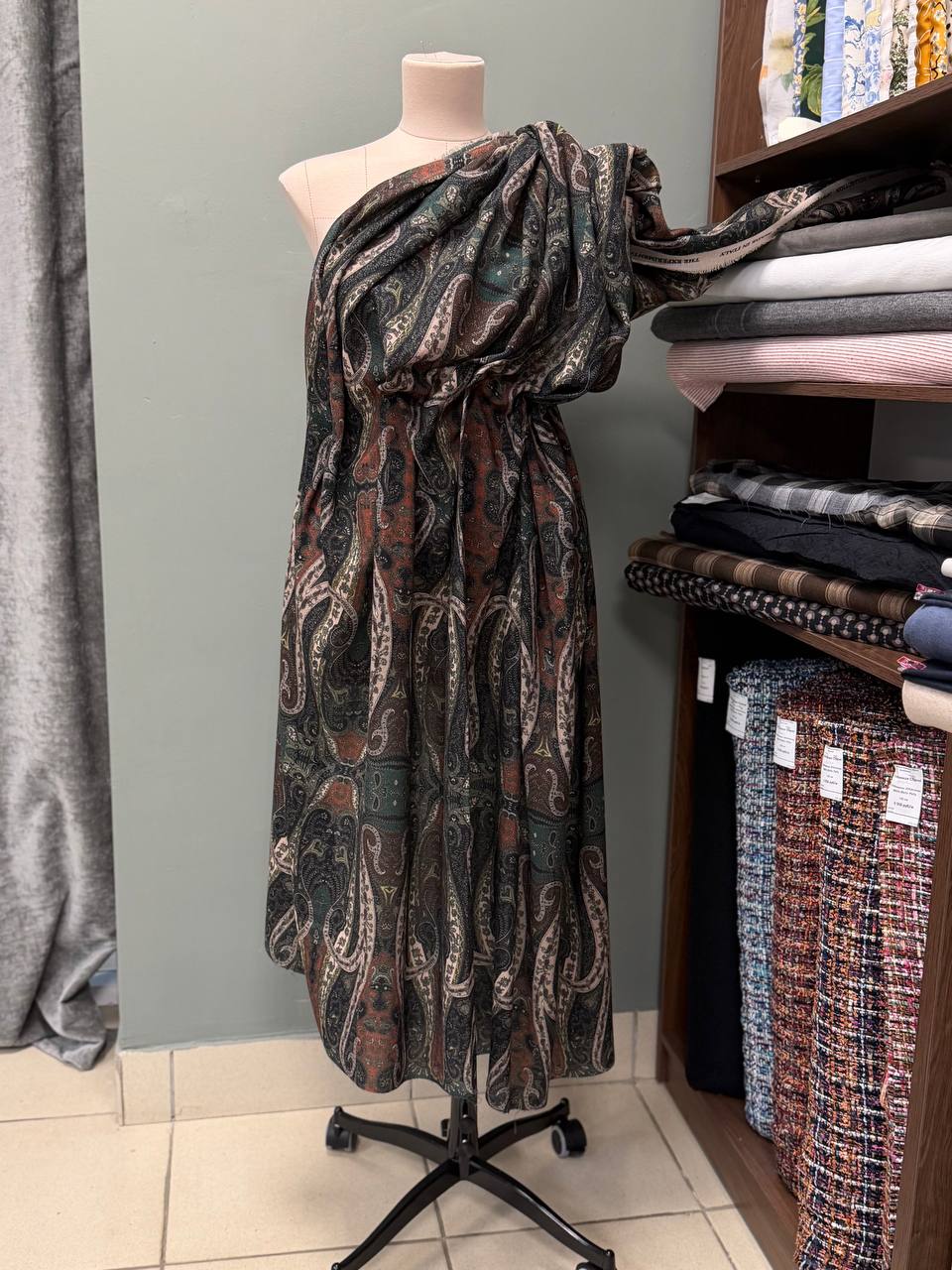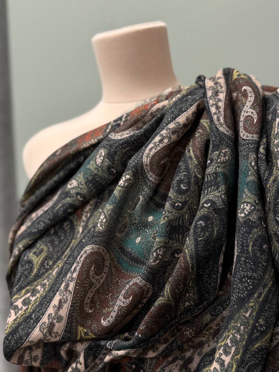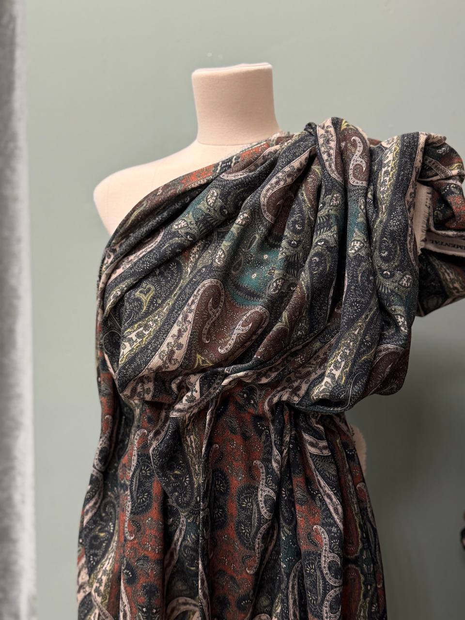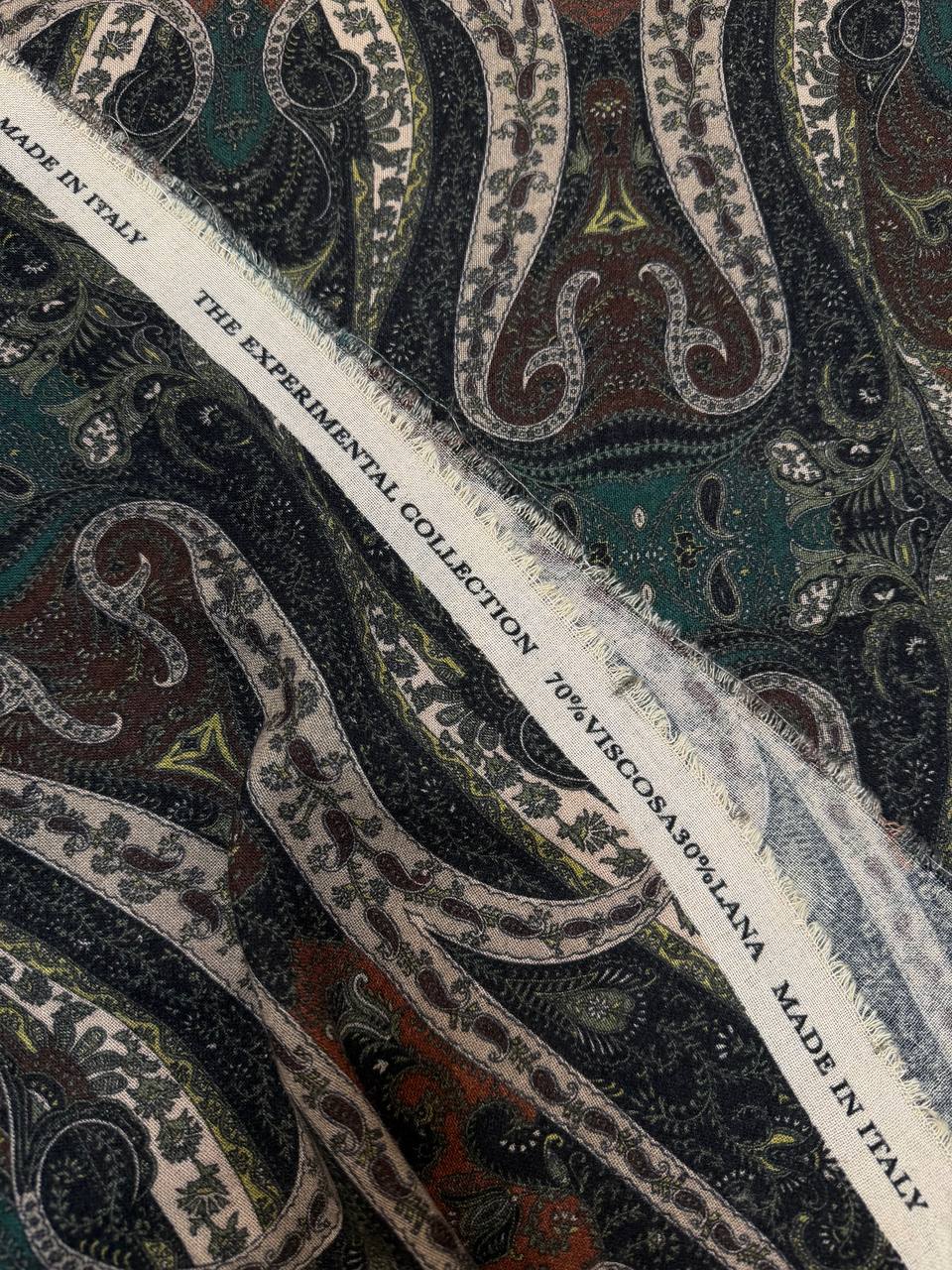 Остаток 4.9 м. Прекрасная плательная ткань. Полотно шероховатое, очень мягкое и уютное. Тактильно больше ощущается шерсть. Шьем платья, блузки, юбки, а так же можно использовать для палантинов. Принт напечатан. Рисунок Etro, рапорт 78см.