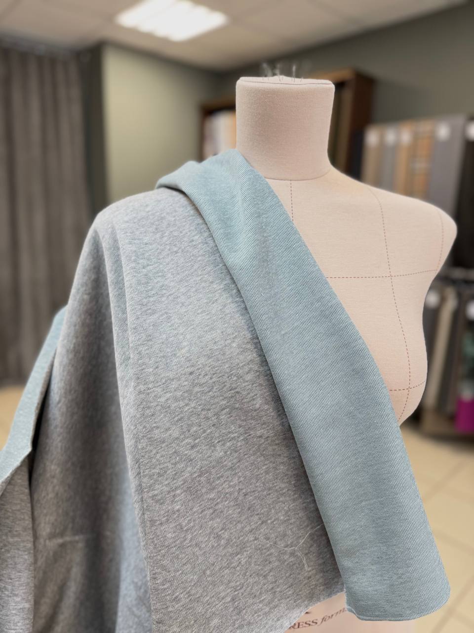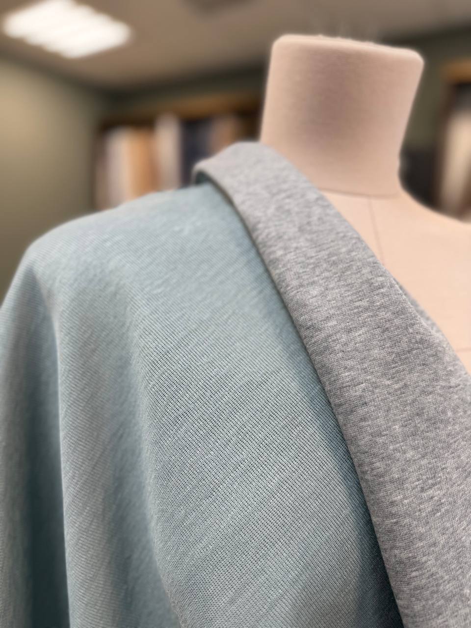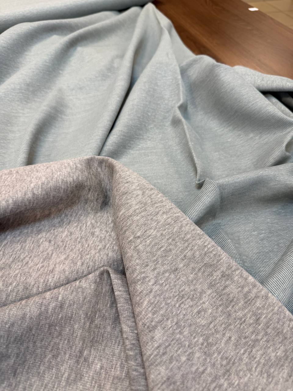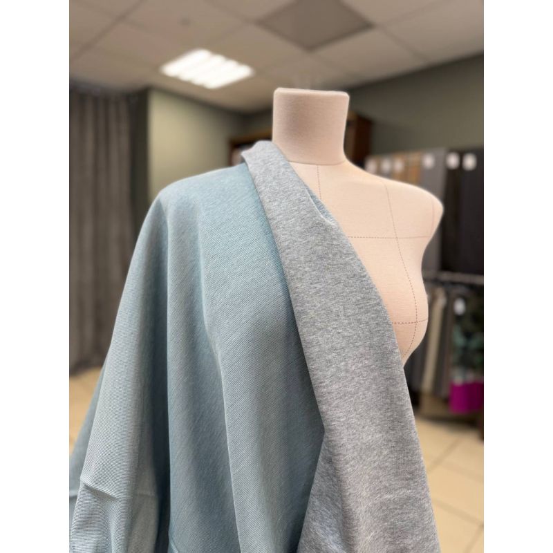 Плотный двухсторонний трикотаж со стока Brunello Cucinelli. Полотно плотненькое, мягкое и пластичное. Одна сторона серый меланжевый хлопок, вторая сторона серо-голубой лен.